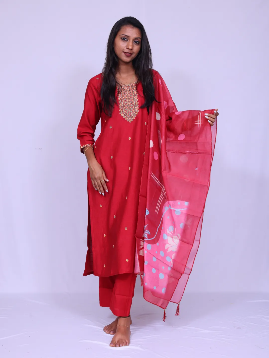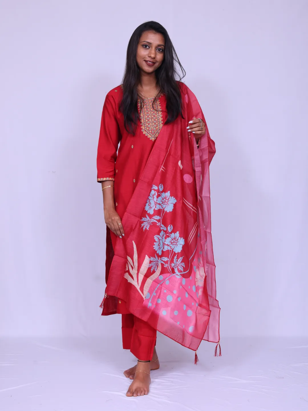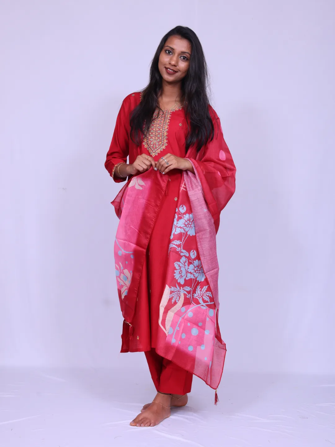 cotton silk slub, poly digital dupatta, round neck, palazzo pant, embroidery at neck and sleeves, 3/4th sleeves
