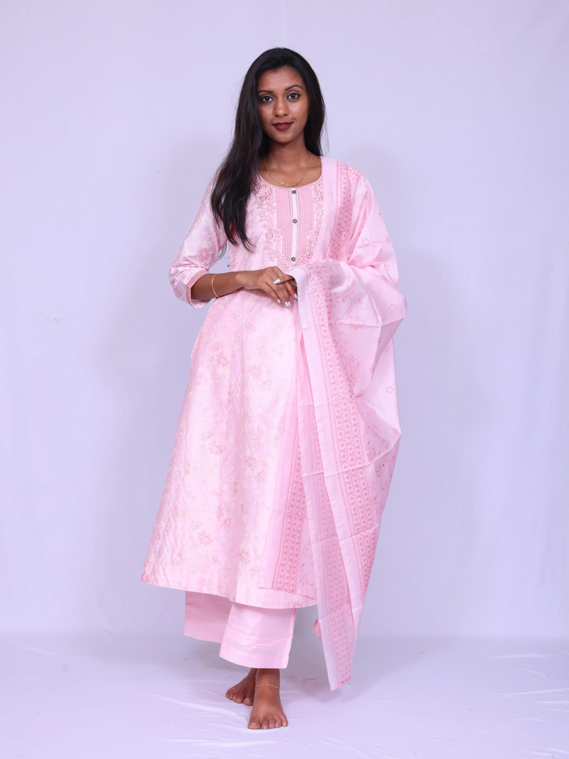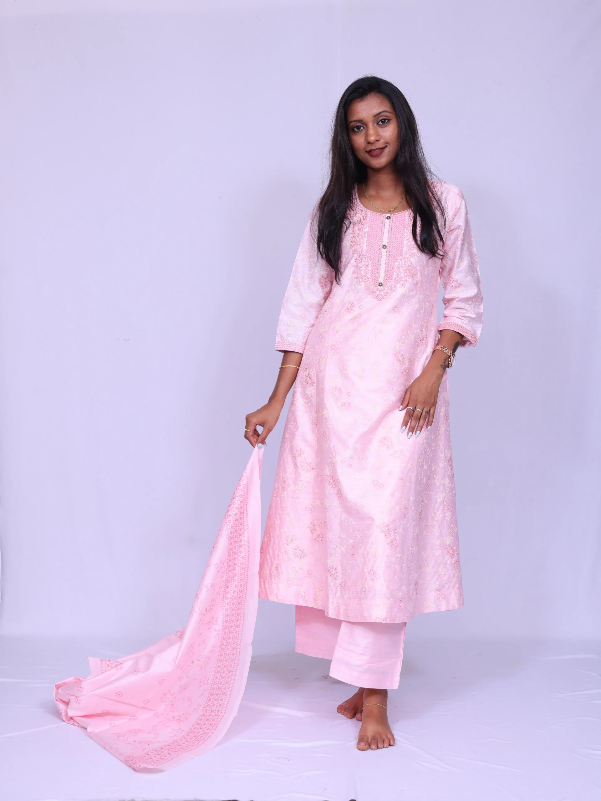 printed silk, round neck, embroidery at neck, 3/4th sleeve, silk dupatta