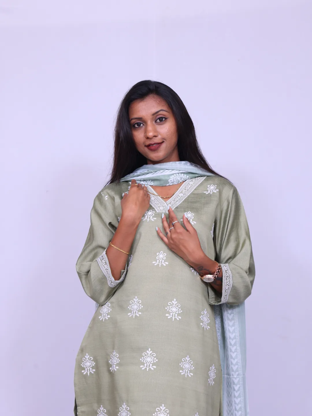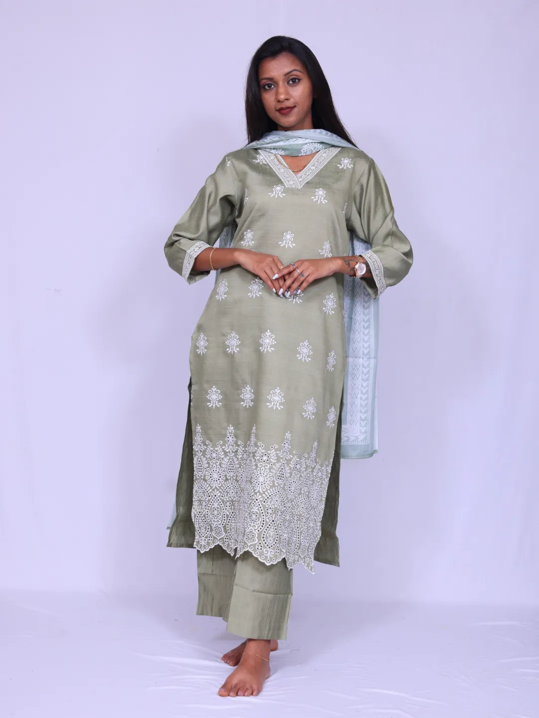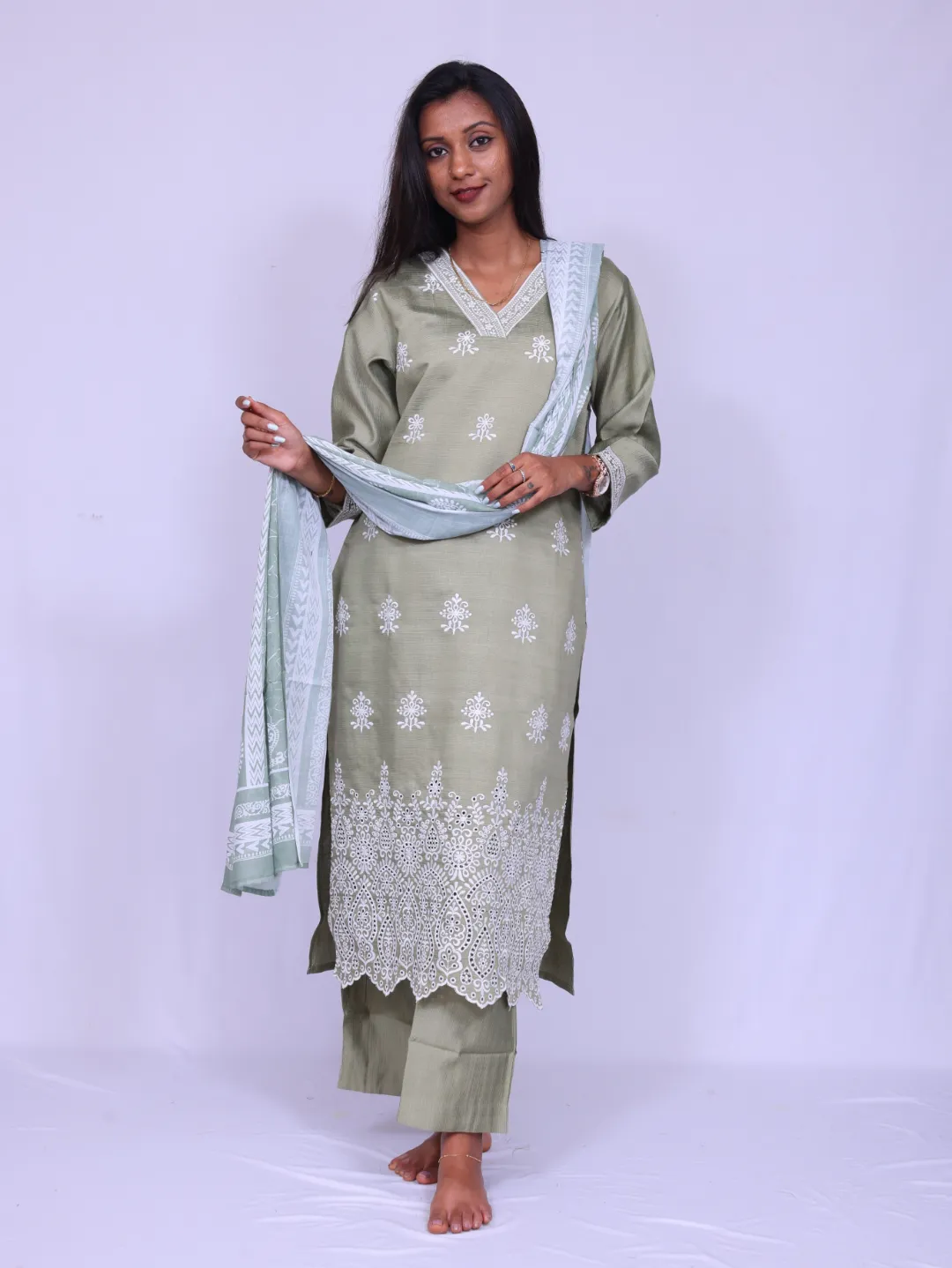 veticom cotton fabric, all over embroidery,V neck printed dupatta, palazzo pant