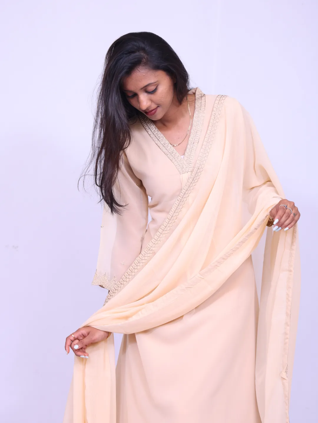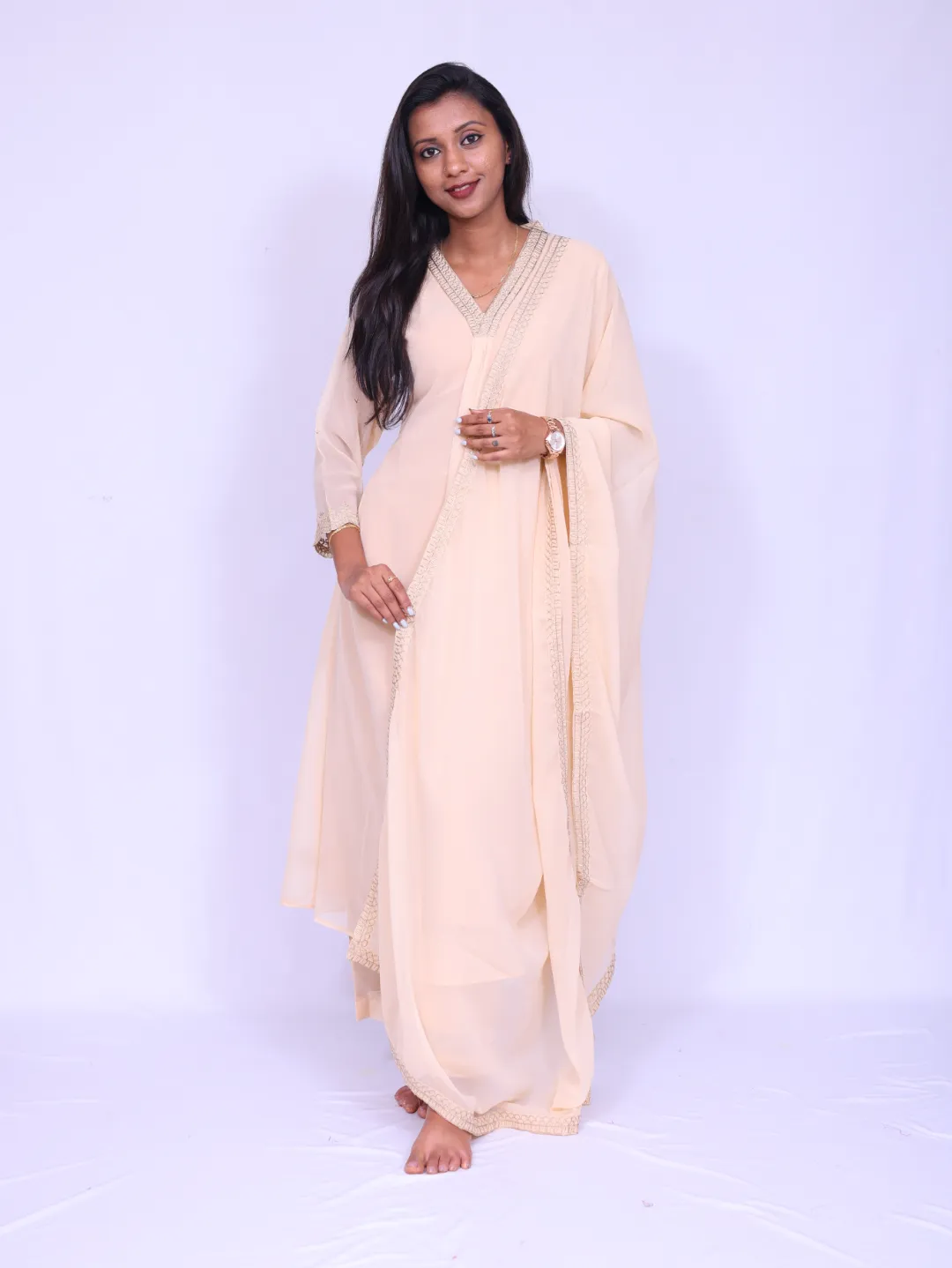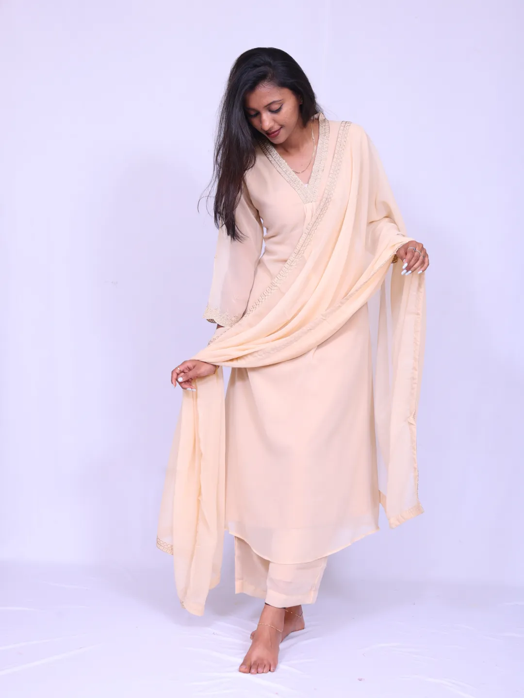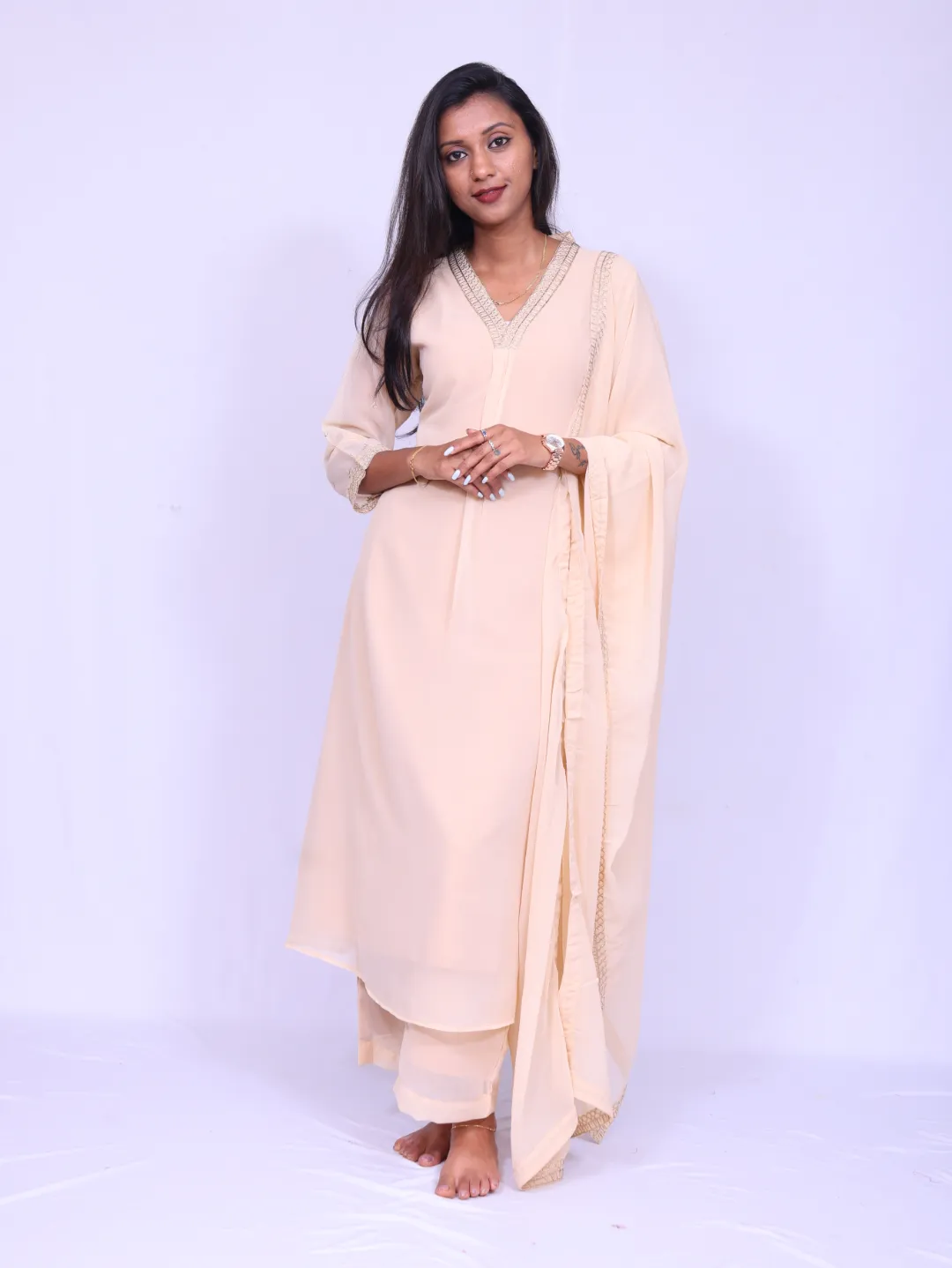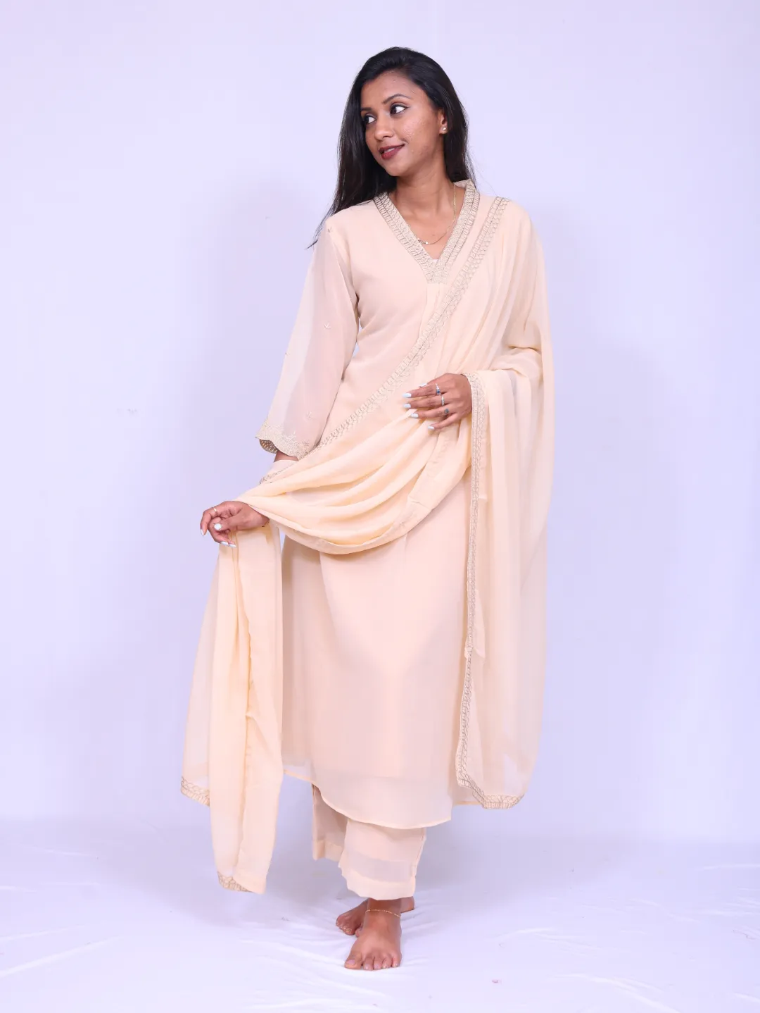 shiffon georgett, V neck, 3/4th sleeves, shiffon georgette dupatta, palazzo with lining